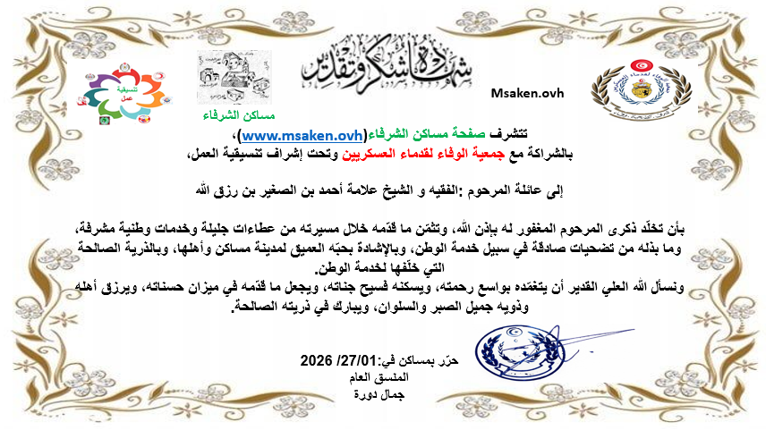 نسأل الله له ولعائلته الكريمة الصحة والعافية وطول العمر، وأن يبارك في جهوده، ويجعل ما قدّمه في ميزان حسناته، وأن يديم على مساكن وأهلها نعمة الرجال الصالحين العاملين آمين .